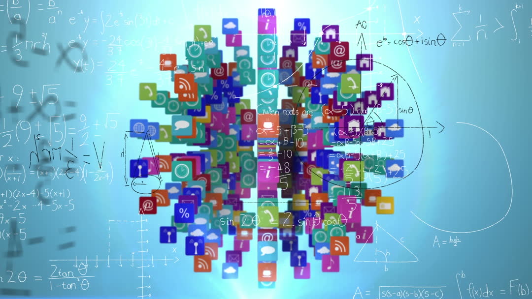 Illustration of various technology and application icons displayed alongside mathematical equations on a blue background. Represents global connectivity, data visualization, and modern digital interfaces. Useful for presentations about innovation in technology, computing advancements, and education in mathematics or data analysis.