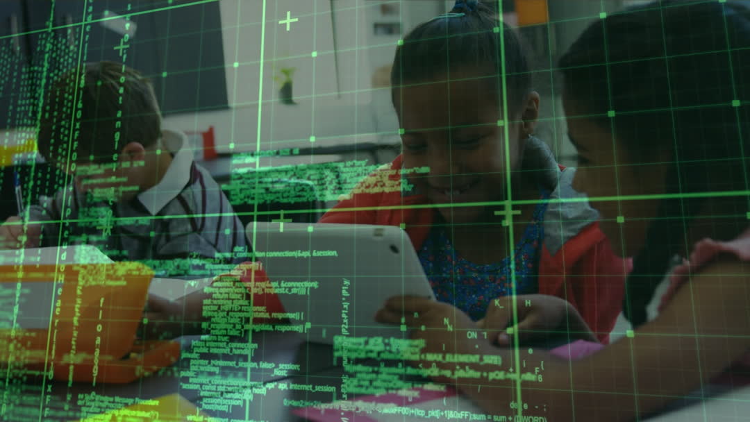 Diverse group of young students using tablets and computers with layered animation showing data processing highlights the integration of digital technology in early education. Illustrates importance of digital literacy, innovation in teaching methods. Useful for education technology articles, coding app promotions, school brochures, educational program highlights.