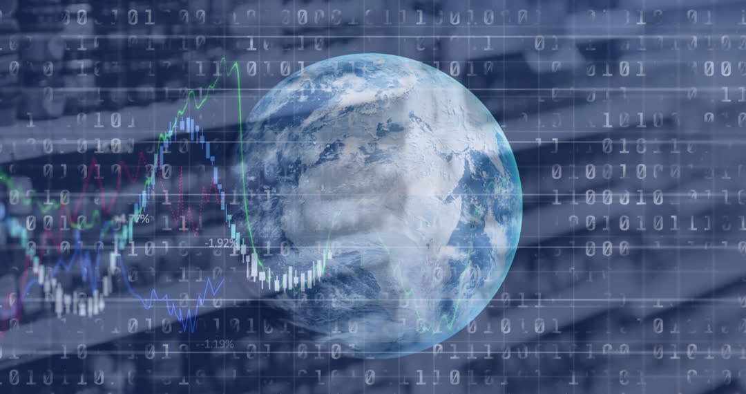 The visualization portrays the interconnectedness of global technology through the dynamic presence of planet Earth behind data streams and network graphs. It serves as an ideal representation for topics involving digital interface technologies, global networking, and data analytics. Suitable for uses in presentations clarifying digital economies, insights analysis, and technological advancements worldwide.