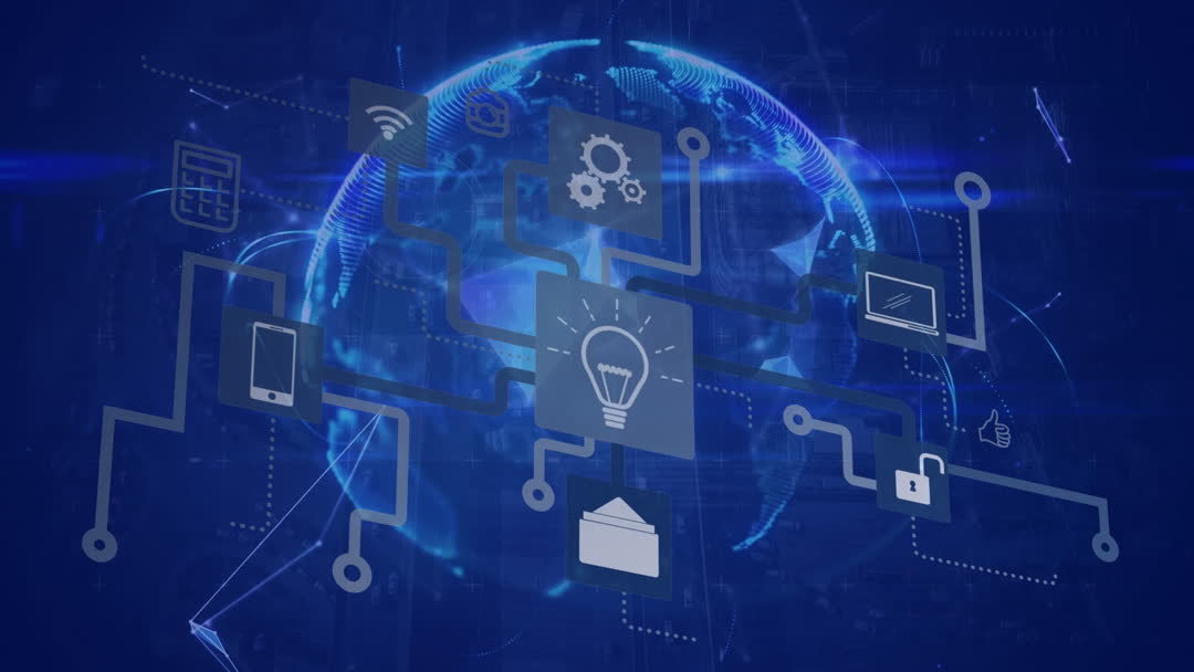 The digital animation illustrates interconnected icons with a globe and cityscape background, symbolizing global technology and digital communication. Useful for technology presentations, innovation concepts, or digital commerce websites to depict connectivity and global interactions.