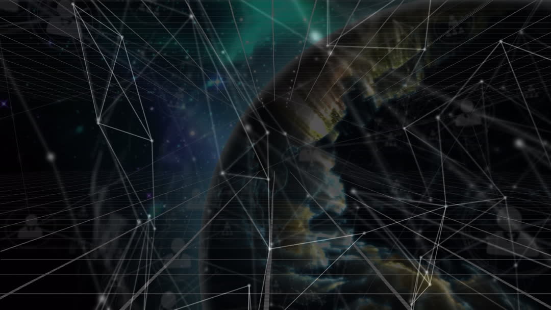 Vibrant animation showcasing a digital network of connections surrounding a globe. Represents global communication and data processing. Often used in tech presentations, IT company promotions, or discussions involving connectivity and digital infrastructure.