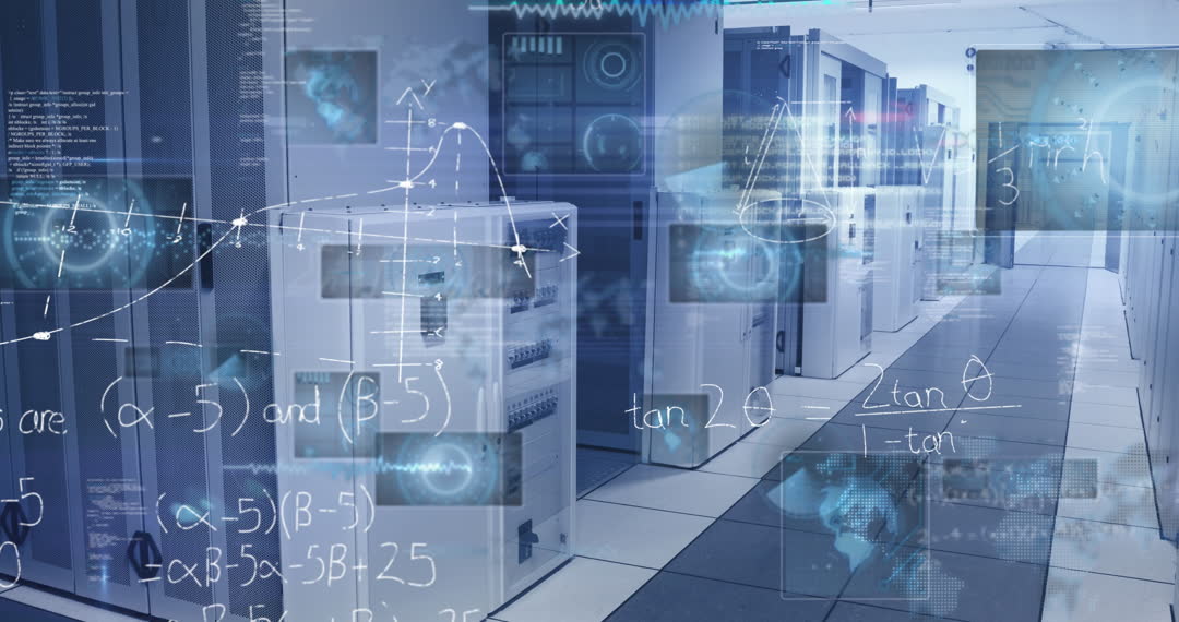 Abstract view of a modern server room overlaid with mathematical equations and data visualizations. Ideal for illustrating concepts of digital technology, data analysis, and advanced computational theories. Useful for technology-focused presentations, articles on computing advances, or network infrastructure showcases.