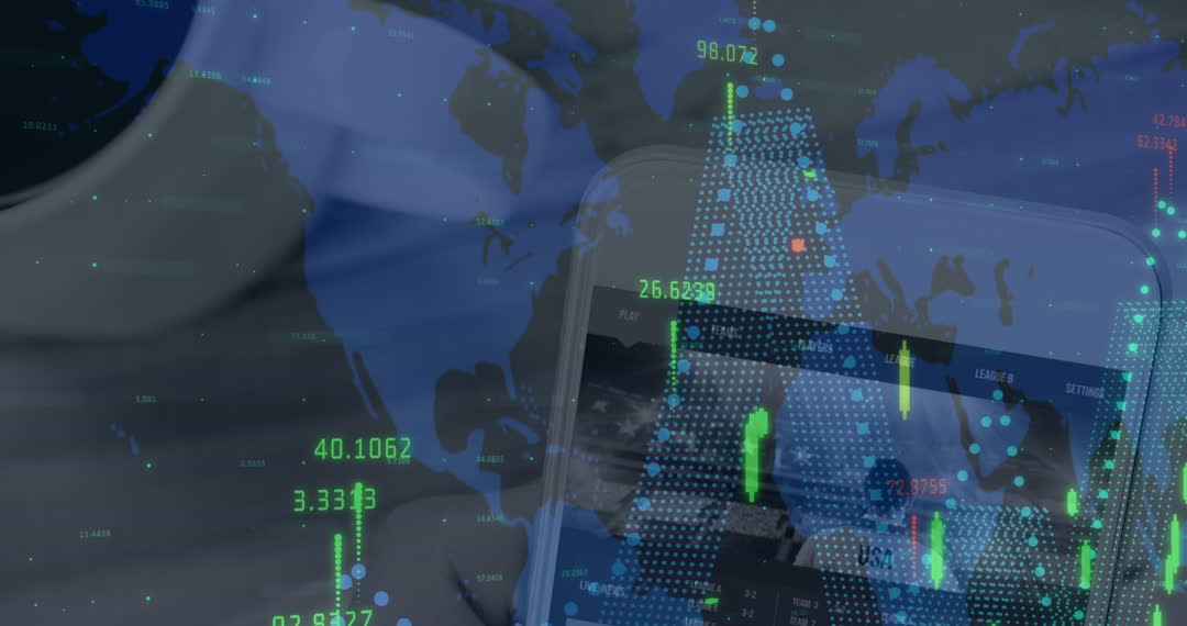Dynamic visualization depicts economic data analytics over global map on mobile interface. Ideal for content centered on financial technology innovations, global business trends, and economic analysis. Useful for promoting business apps, financial analysis tools, and educational resources on stock market insights.