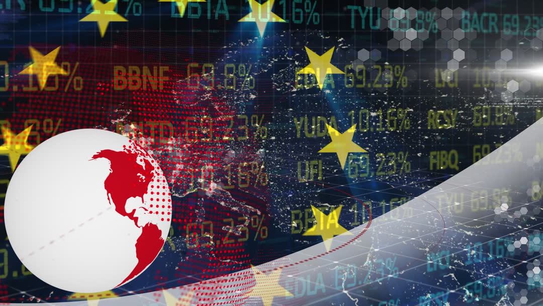 Scene displaying a digital rotating globe and EU stars with various currency rates and trading figures, perfect for projects related to global business, investment, financial news, economic analysis, and currency fluctuation. Suitable for use in presentations, articles, or media focused on international market dynamics and trade partnerships.