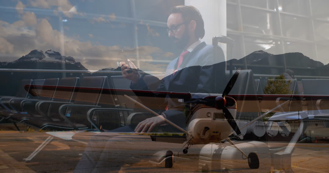 Illustrates global travel and connectivity featuring digital network animations overlaying an airplane. Suitable for marketing material, presentations on global travel trends, technology in transportation, and business conferences.