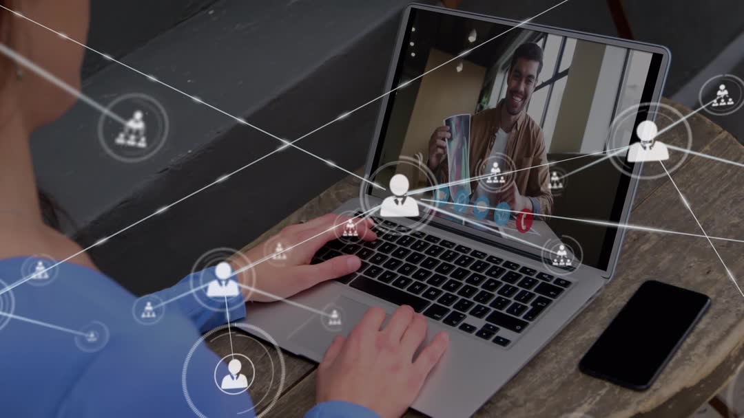 Multiple virtual connections and icons overlap screen showing individuals engaged through video call on laptop. Illustrating extensive digital multiplatform communications in remote professional settings, suited for featuring themes in global video networking, remote work advancements or interactive technologies influencing global/client interfaces.