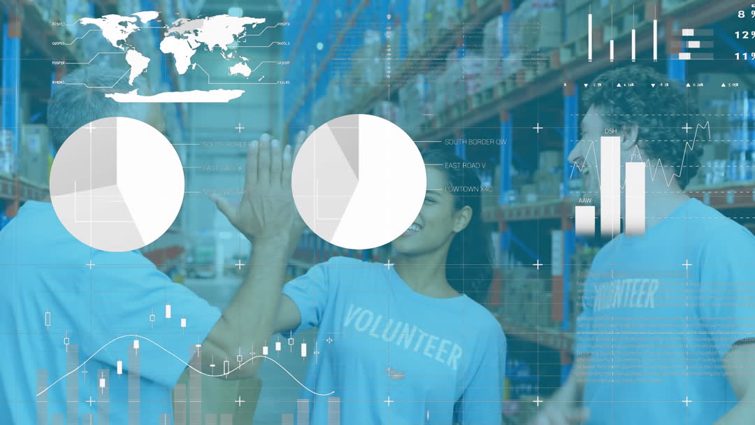 Diverse team of volunteers in a warehouse, depicted through animated overlays of charts and global data. This concept illustrates collaboration and data analysis in logistics and finance contexts. Useful for presentations on teamwork, global trading, or volunteer impact assessments.