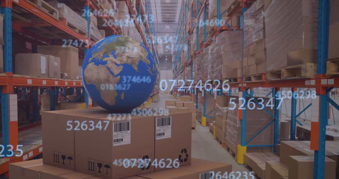 Visual depicts warehouse setting with focus on global logistics and inventory management. This is represented through animated globe and data elements, suitable for presentations on global shipping networks, supply chain efficiency, and technology integration in logistics. Useful for business presentations, technology blogs, and educational materials on modern warehouse operations.