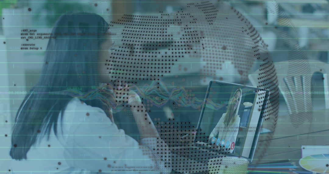 Image portrays a virtual business meeting setup with a focus on international connectivity. The digital overlay of a globe and tech visuals suggest globalization and data interaction. Useful for illustrating remote work, global communication, or technology-driven business strategies.