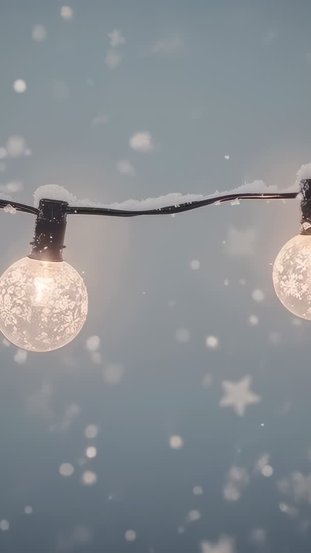 AI Generated Video. Vertical clip showing globe string lights glowing softly while fresh snow falling and collecting on black sockets and cable. Background featuring soft bokeh and star-shaped snowflake highlights, cool blue tones and warm bulb glow creating cozy winter atmosphere. Close-up composition with shallow depth of field and gentle motion allowing easy looping. Ideal for social media stories and reels, mobile wallpaper, seasonal ad campaigns, holiday greeting animations, promotional banners, product showcase backdrops, event invitations and mood-setting video intros. Suitable for overlaying text and logos, pairing with slow pan or subtle parallax, and color grading to emphasize warm-cool contrast. License-friendly clip ready for editing and looping in winter and holiday projects.