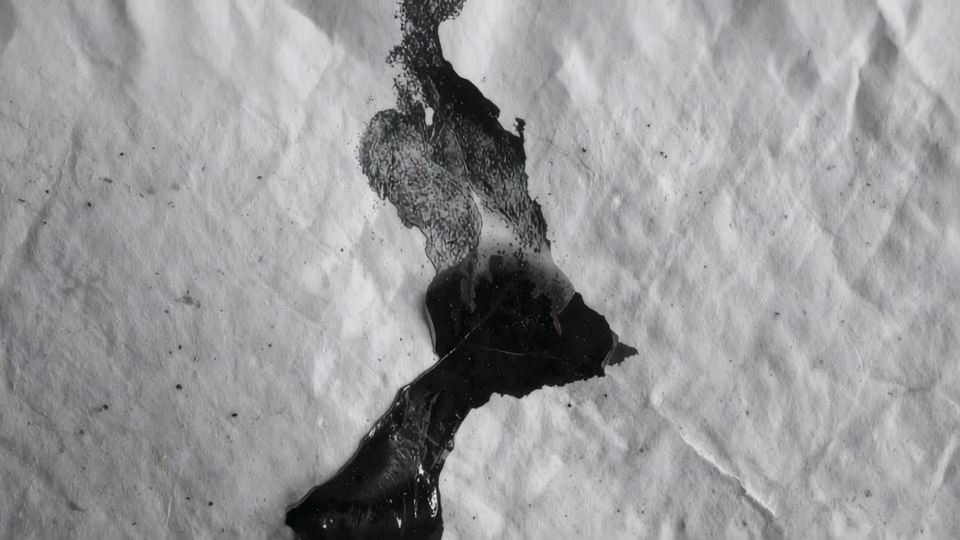 AI Generated Image. Showing glossy black ink spreading across crumpled white paper, frame capturing upward-moving viscous streak and scattered pigment specks. Featuring strong diagonal composition and high-contrast monochrome tones, highlighting textural detail of paper fibers and reflective wet surface. Working well as background plate, title sequence element, texture overlay, or abstract transition in editorial videos, motion graphics, advertising, or art films. Providing close-up material for print design, album covers, packaging concepts, social media promos, website header loops. Enabling color grading experiments, masking tests, and creative editing focused on organic motion and tactile surface.