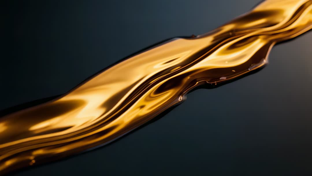AI Generated Image. Macro slow-motion video showing glossy golden liquid ribbon flowing across dark background, forming undulating curves, ripples, and small droplet breakup. Warm amber highlights and mirror-like reflections creating luxurious metallic feel suitable for premium branding. Footage working well as looping background for luxury brand promos, beverage or oil commercials, cosmetics packaging, motion graphics overlays, title sequences, social media ads, website hero banners, and product reveal animations. Recommending color grading to match brand palette, cropping for vertical social formats, adding subtle particle or text layers for headline treatment, and timing loop points for seamless playback. Useful for editorial design, advertising, VFX projects, and abstract artistic visuals.