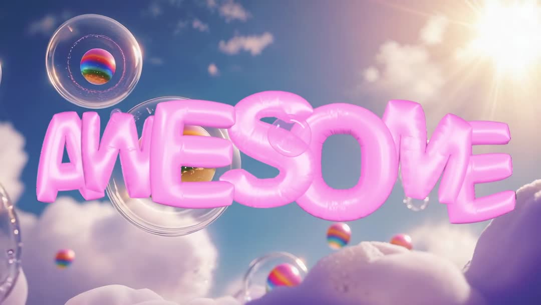 AI Generated Video. 3D glossy pink letters form the word 'AWESOME', appearing whimsical as they float among cotton-like clouds under a clear sky lit by the sun. Rainbow bubbles surrounding the letters add a surreal and magical environment enhanced with cheerfulness and creativity. This vibrant design blends a sense of imagination and positivity, beautifully creating an impactful statement on dreams and aspirations. Perfect for motivational artwork, decorative posters, inspirational quotes, and visionary projects emphasizing creativity and optimism.