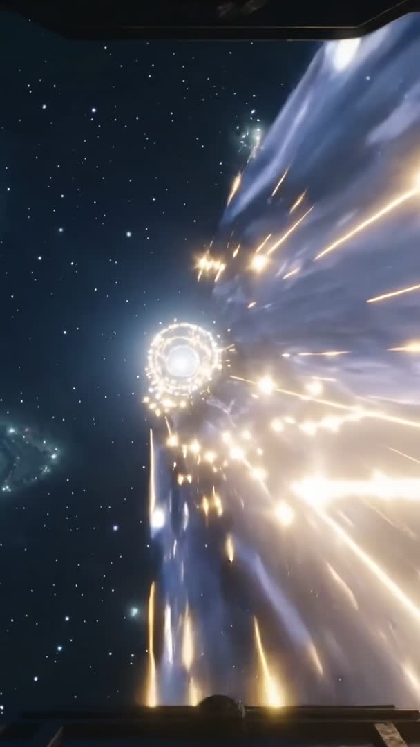- Glowing alien craft approaching energy ring through starfield vertical sci-fi warp chase
