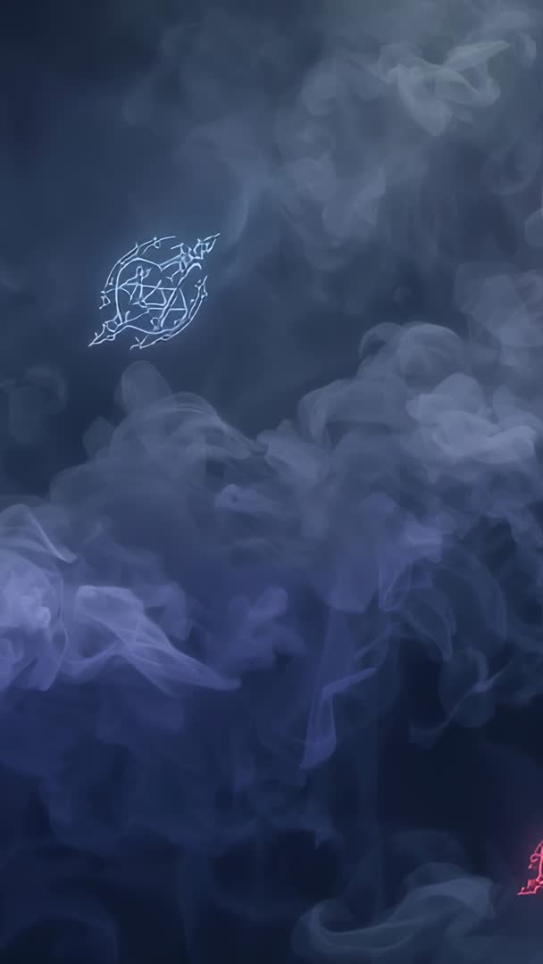 AI Generated Video. Vertical video showing glowing light-blue pentagram sigil bobbing gently across deep navy sky, wispy smoke and vapor swirling through frame. Small neon red glyph appearing near lower-right corner, creating striking color contrast and focal interest. Composition leaving generous copy space for headline, logo, or caption, with vertical aspect optimized for mobile-first viewing. Loop-friendly motion offering seamless playback for extended displays. Suited for social media stories, vertical ads, mobile wallpapers, and app intros, enhancing mystical, occult, or sci-fi narratives. Working well as background for title cards, music visualizers, game menus, streaming overlays, Halloween promotions, and VJ loops.