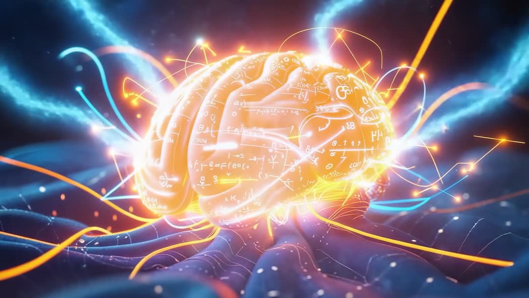 AI Generated Image. Image features a glowing brain model charged with energy currents and embedded formulas. Bright cables and a digital matrix suggest advanced neural technology, perfect for use in AI, innovation, and futuristic themed projects. This visual can enhance technological blogs, science presentations, or creative tech publications to illustrate concepts of artificial intelligence and emergent technologies.