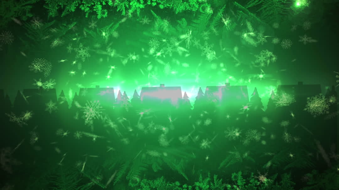 Digitally generated scene featuring intense glowing green lights illuminating rows of fir trees beneath falling snowflakes. This captivating animation captures the essence of winter and Christmas celebration. Ideal for holiday greetings, festive presentations, backgrounds for seasonal events, and promoting Christmas themed productions.