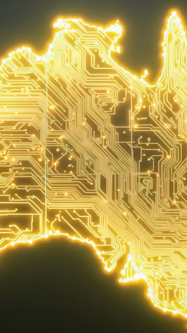 AI Generated Image. Vertical 9:16 video showing glowing circuit map of Australia, tracing coastline with filament and pulsing nodes. Golden circuitry lines flowing across landmass, highlighting major network routes and urban hubs. Futuristic tech visual suitable for telecom, data analytics, fintech, smart cities, national infrastructure presentations. Ideal for vertical social ads, mobile app intros, conference openers, news segments, website hero banners, pitch decks. Editable color and speed options allowing brand integration and pacing. Looping friendly for background display and live event visuals. Use as opener for corporate videos, transition clip for broadcasts, or animated infographic element for data storytelling.