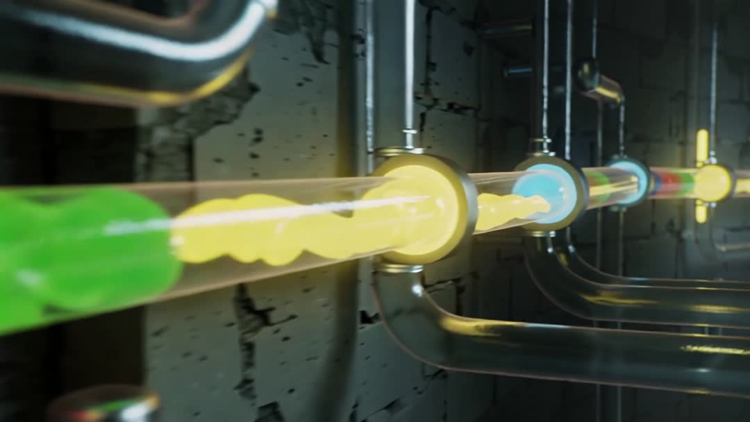 AI Generated Image. Video showing glass pipeline carrying glowing multicolored slug-like fluids along worn brick wall while illuminated rings pulse at pipe joints. Camera tracking along pipeline, focusing on flowing motion, luminescent color transitions, and industrial textures. Lighting creating moody cinematic atmosphere with shallow depth of field and subtle reflections on tubing. Useful for technology promos, industrial process visuals, sci-fi sequences, and motion graphics needing futuristic or experimental lab vibe. Suitable as visual metaphor for data flow, energy transport, chemical processing, or creative transitions in corporate videos and presentations. Editable for color grading, loopable for seamless backgrounds, and compatible with overlays, titles, and sound design.