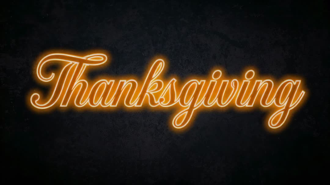 - Glowing cursive Thanksgiving neon sign animating orange halo on dark textured wall