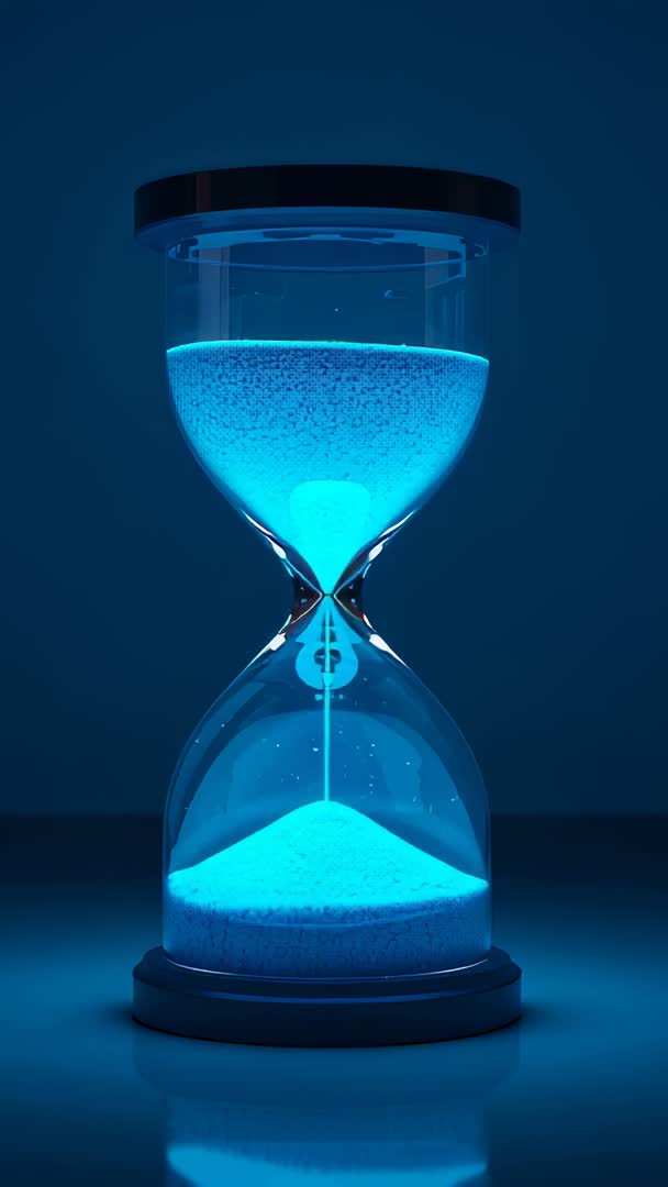 AI Generated Image. Vertical video showing glowing cyan hourglass pouring fine granular sand through narrow neck into lower chamber, creating crisp symmetrical silhouette and strong reflection on glossy surface. Lighting emphasizing vibrant blue tones and soft internal glow, producing futuristic minimalist mood and high contrast highlights. Clip working well as loopable background for countdown sequences, time management tutorials, productivity app promos, website hero loops, social media vertical ads, presentation intros, technology or science concept visuals. Recommended uses include short-form video content, animated banner, title sequence, visual metaphor for deadline or limited time offers, and ambient background for corporate or educational materials.