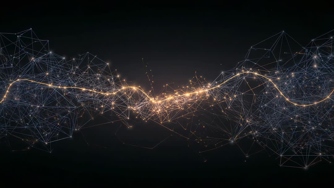 Glowing Data Waveform Linking Mesh Networks with Pulsing Sparks for Futuristic Motion Video
