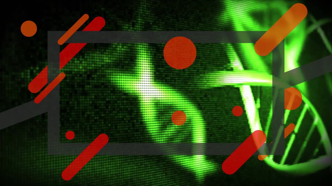 Vibrant video showcasing a glowing DNA helix floating against a dynamic green background, with abstract orange and red geometric shapes overlaid. The thoughtfully designed grid illuminates a sleek, modern edge, ideal for use in multimedia slides, presentations in scientific exploration, cutting-edge biotechnological developments, and discussions around engineering and digital artistry future visual themes.