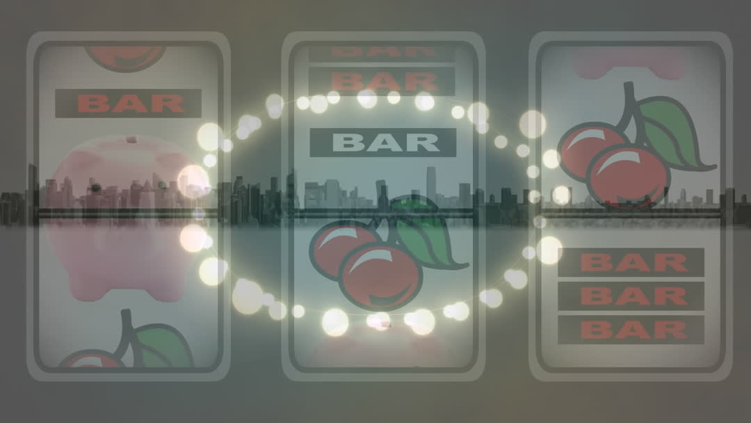 Glowing Fairy Lights Over Slot Machine with Cityscape Overlay Video