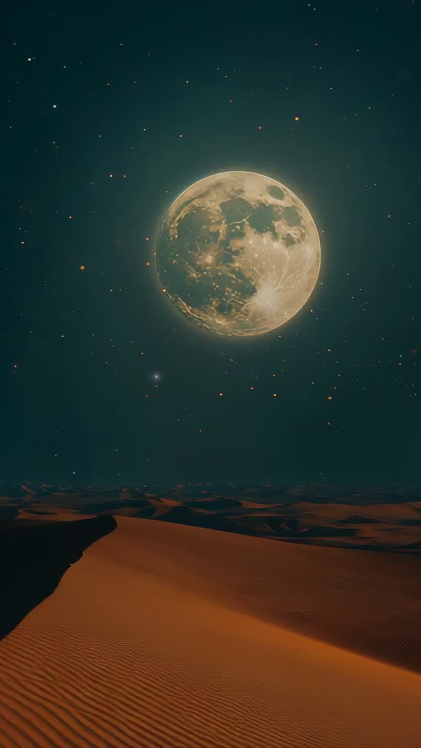 AI Generated Image. Vertical cinematic clip showing glowing full moon slowly rising above rolling desert dunes while stars are twinkling and subtle sparks are drifting across sky. Warm moonlight casting long shadows on rippled sand, creating high-contrast textures and dramatic depth. Scene fitting mobile backgrounds, social media reels, app intros. Serving travel promos, astronomy features, meditation and relaxation videos, cinematic openers, sci-fi trailers, website hero banners, environmental campaigns. Color palette featuring warm golds and deep teal night sky, offering strong contrast for text overlays and logo placement. Offering horizontal cropping options for widescreen use from original footage. Recommended usage: overlaying simple headline, adding slow cinematic music or ambient soundscape, using gentle pan or slow zoom to enhance mood. Licensing suggestions: suitable for commercial advertising, editorial storytelling, and stock video libraries.