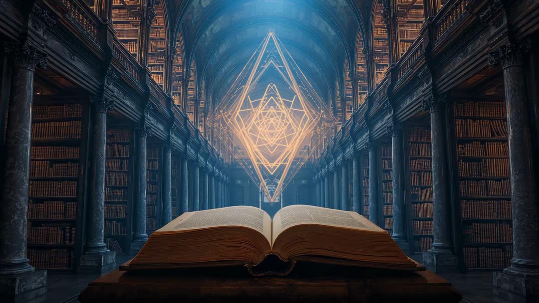 - Glowing Geometric Polyhedron Forms Above Ancient Book in Library