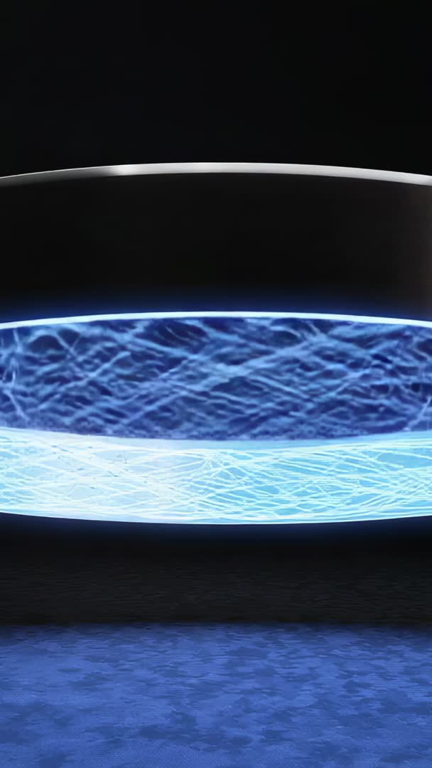 AI Generated Image. Video showing glowing glass torus transforming from knotted blue filament core into smooth metallic halo over dark stage. Ring rotating slowly, emitting soft luminescent blue light and subtle reflections for high contrast impact. Composition suiting title intros, logo reveals, product showcase clips, music visualizers, technology promos, event projections and futuristic presentations. Vertical orientation optimized for mobile phones, stories, reels and vertical ad placements. Easy to loop for seamless motion backgrounds or for layering into motion graphic compositions and UI transitions.