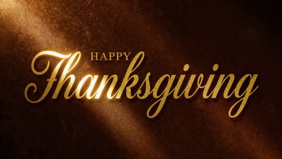 AI Generated Image. Gold cursive 'Happy Thanksgiving' headline glowing over warm brown textured backdrop, with soft diagonal light beam and subtle sparkles sweeping across frame, creating elegant festive mood. Ideal for social media video posts, holiday email headers, website hero banners, digital greeting card animations, TV and streaming ads, event invitations, slideshow openers, in-store digital signage, and seasonal marketing campaigns. Allowing easy color and text edits for brand matching, looping for background ambiance, adding voiceover or music for greeting spots, and overlaying logo or call-to-action. Mood conveying warmth, gratitude, luxury, and nostalgia; style suited for retail, hospitality, nonprofit, corporate communications, and family outreach. Best used as short looping background, intro title, or centerpiece for seasonal promotional content.
