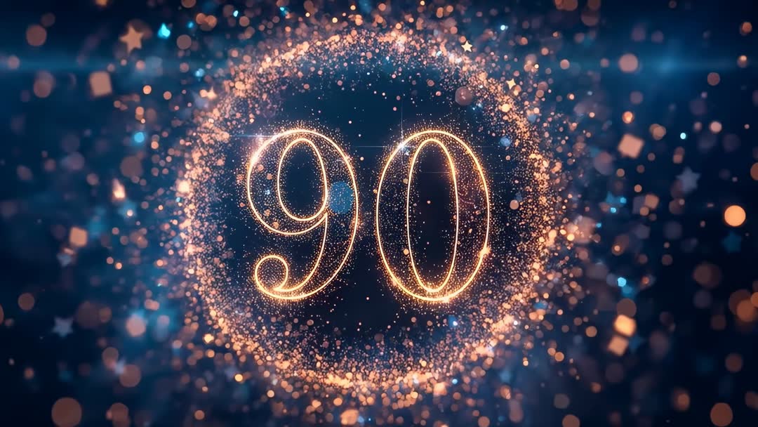 - Glowing golden 90 forming in sparkling particle halo, pulsing bokeh countdown