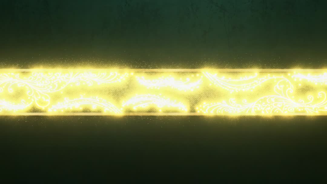 AI Generated Video. Featuring glowing golden filigree band running horizontally across dark green panel, with sparks popping and glitter falling while ornate scrollwork motifs are revealing beneath luminous glow. Showing high-contrast center light with subtle particle dust and soft edge vignette for cinematic look. Ideal for using as video overlay, title reveal, logo sting, luxury branding intro, holiday greeting animation, product presentation, website header, social media promo, or event opener. Suggesting loop-friendly edit by matching first and last frames for seamless repetition, applying gentle color grading to enhance gold tones, and adding soft sound design with chimes or whoosh for fuller impact. Delivering versatile composition for 16:9 and 2.35:1 timelines, supporting color-corrected masters and export to MP4, MOV, or image sequence for motion graphics workflows.