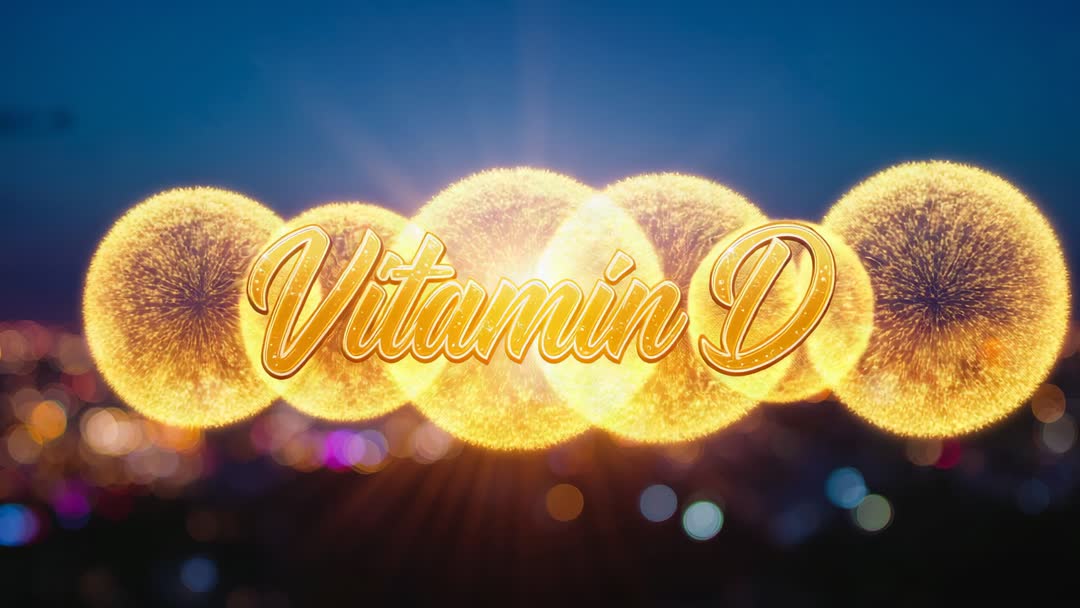 Glowing Golden Vitamin D Typography with Sunburst Particle Halos over Twilight Cityscape Video