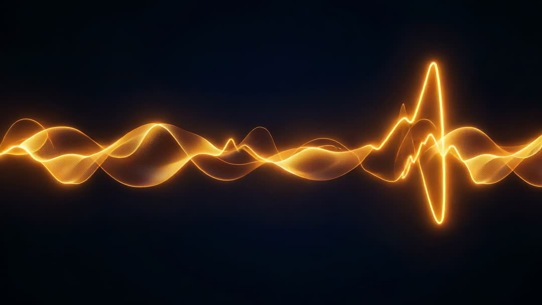- Glowing golden waveform moving across navy backdrop with rising pulse peak