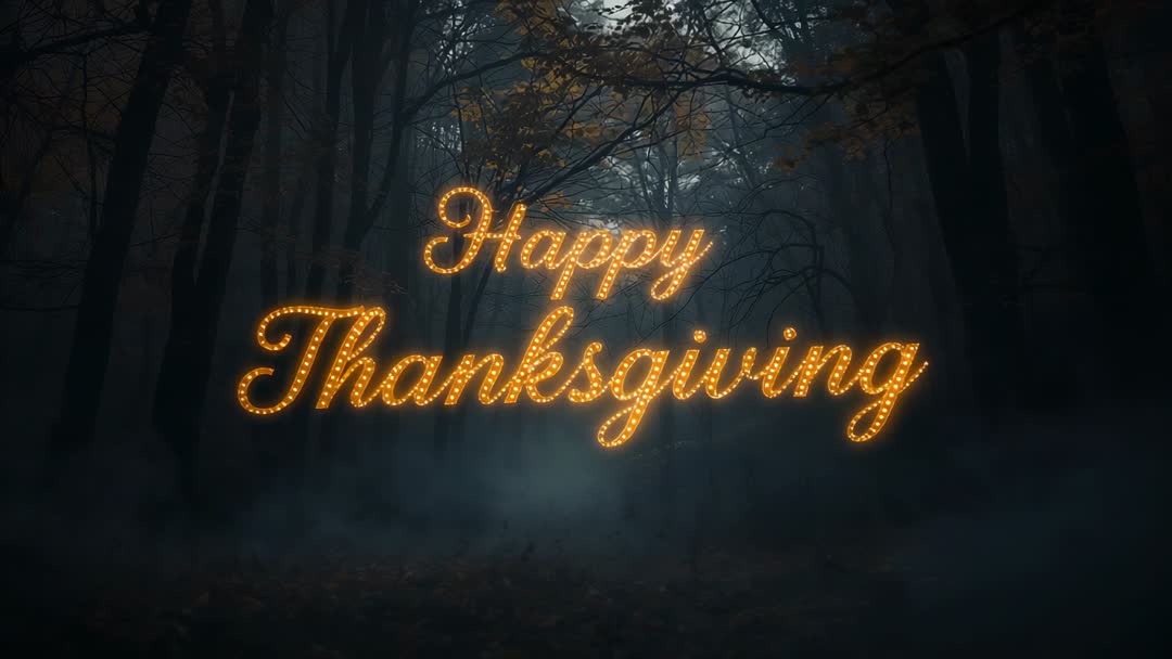 AI Generated Image. Video clip showing glowing Happy Thanksgiving marquee pulsing warm bulbs while mist drifting through shadowy woodland at twilight. Warm amber lettering contrasting with cool blue fog, creating moody cinematic atmosphere. Marquee lettering occupying center, backlit leaves and tree silhouettes framing scene, subtle camera push or slow pan working well. Ideal for holiday video opener, social media greeting, store window display animation, event invitation background, seasonal email header, banner for holiday sales, Halloween-to-Thanksgiving crossover content, themed party promo, digital signage in restaurants or malls. Suggestions for use include overlaying text or logo on lower third, looping clip for ambient screens, pairing with acoustic or orchestral soundtrack for cinematic feel, color grading toward warmer tones for family-friendly vibe, and adding particle effects for magical look. Technical notes: high-contrast lighting and negative space providing safe area for text placement, cinematic aspect ratio fitting 16:9 templates and social square crops.