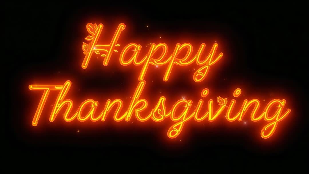 AI Generated Image. Glowing Happy Thanksgiving neon script pulsing against black backdrop, emitting warm orange halo and scattered sparkles. Cursive lettering featuring subtle leaf accents and soft halo glow, creating cozy, celebratory mood. Motion characterized by gentle pulsing and light twinkle, looping seamlessly for continuous playback. Ideal for holiday content creation, including social media posts, Instagram reels, Facebook cover videos, email headers, website hero banners, and online ads. Useful for digital signage and storefront displays, restaurant or cafe seasonal promos, event invitation backgrounds, and video overlays for Thanksgiving livestreams. Editable placement and color grading suggestions: match brand palette, adjust glow intensity, or pair with soft bokeh overlays for richer atmosphere. Supplied as short repeating clip for easy timeline integration and title card use.