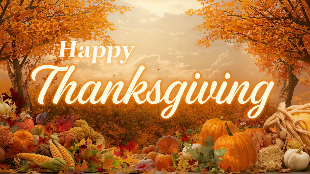 AI Generated Image. Showing glowing Happy Thanksgiving text over golden autumn field with drifting leaves and soft floating light. Featuring foreground harvest display with pumpkins, gourds, corn ears, dried husks, and colorful fall foliage creating rich harvest composition. Creating warm, nostalgic mood with soft sunset glow and rural tree silhouettes. Working well for holiday campaigns, social media posts, animated greeting cards, event invitations, retail banners, email headers, website hero loops, recipe videos, restaurant promotions, seasonal sale ads, farmer market marketing, and printable posters. Allowing easy customization for adding logo, overlay text, animated leaf motion, or background music. Suitable for celebrating family gatherings, community festivals, store promotions, and seasonal storytelling.