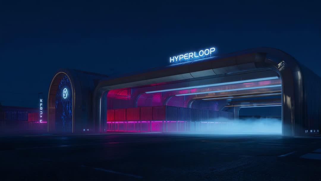 AI Generated Image. Showcasing glowing Hyperloop terminal at night, featuring neon signage, arched bays, stacked cargo containers, and low-lying fog drifting across apron. Employing electric blue and magenta lighting tones, creating cinematic contrast and moody futuristic atmosphere. Serving well for tech branding, transport concept articles, corporate presentations, advertising campaigns, film or game concept art, and web hero banners. Providing ample negative space for title, logo, or superimposed text on right side. Captured as cinematic video frame, suitable for motion backgrounds, looping footage, or concept reels illustrating future transit, urban logistics, or smart infrastructure.