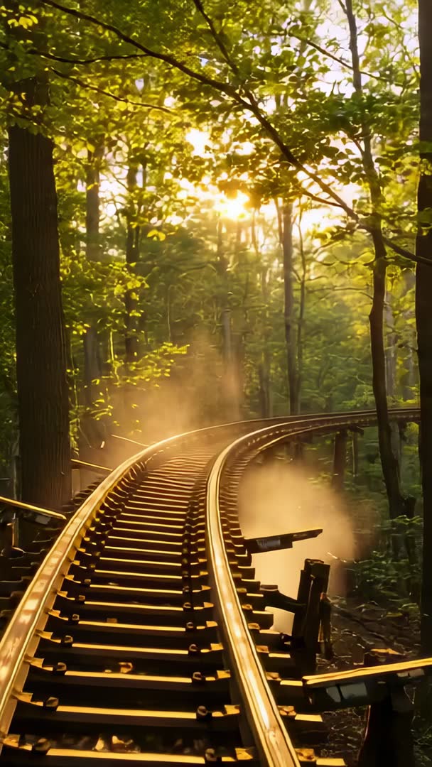 AI Generated Image. Vertical video showing narrow-gauge rails curving on elevated wooden trestle through sunlit forest during golden hour, with mist and sunbeams creating atmospheric backlight. Warm golden tones and glowing rails creating strong leading lines and cinematic depth. Perfect for social media Reels, TikTok, vertical adverts, website hero banners, travel vlogs, nature documentaries, railway history segments. Serving as background for title sequences, product promos, mindfulness or relaxation videos, tourism campaigns highlighting scenic train rides. Pairing well with slow motion, ambient soundtrack, voiceover narration about journey, exploration, heritage, conservation. Licensing suiting editorial and commercial projects across lifestyle, tourism, transportation industries. Try enhancing warm highlights and preserving shadow detail for moody contrast; crop-safe for mobile-first vertical deliverables.