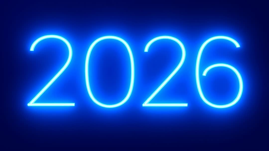 AI Generated Video. Featuring glowing cyan neon numerals 2026 on deep blue backdrop, halo glow outlining digits and creating high-contrast futuristic atmosphere. Clean minimal composition centering bold numerals for maximum legibility in motion graphics and broadcast. Highlighting neon light bleed and soft vignette for cinematic depth. Suiting countdown videos, new year promotions, product launch teasers, event openers, social media reels, website hero loops, presentation slides, digital signage. Providing ready-to-use visual for designers and editors seeking modern technology or future-themed aesthetic; supporting color grading and overlay text placement without distraction.
