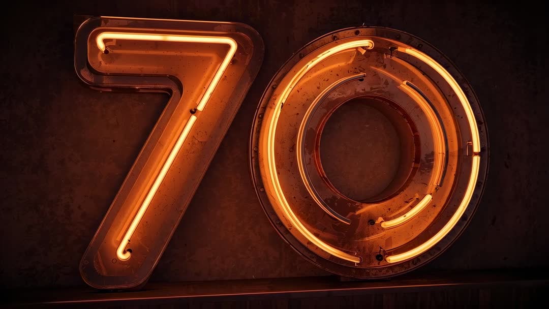 AI Generated Video. Showing glowing neon number 70 with rusted metal housing, exposed glass tubes, and vintage patina. Featuring warm amber light, visible wiring, and textured metal surface for moody retro aesthetic. Creating strong focal point for anniversary and milestone campaigns, retro bar signage, product packaging, event posters, social media banners, website hero backgrounds, album covers, title screens, and video intros. Working well as layered video element or still frame for motion graphics and VJ loops; easy to composite over dark footage or vinyl textures. Capturing shallow depth of field and directional lighting, highlighting glass reflections and surface imperfections. Focusing color palette on warm orange, deep brown, and rust tones for nostalgic atmosphere. Suggesting use in branding, advertising, editorial spreads, set design references, and lifestyle collages. Including metadata keywords for search optimization and easy licensing.