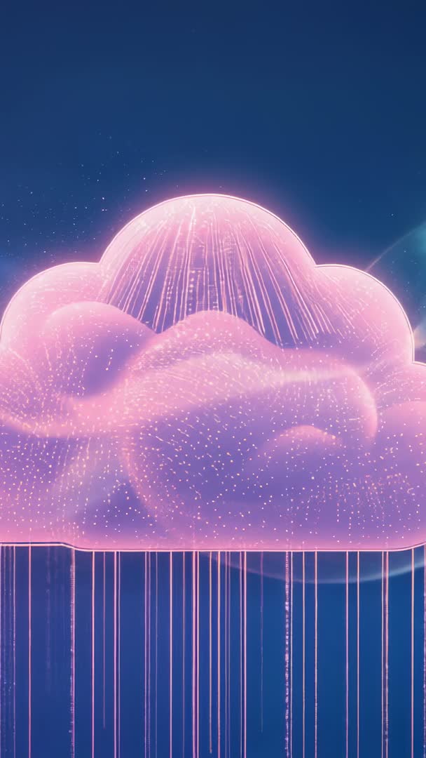 AI Generated Image. Video showing glowing pink-purple cloud dome emitting vertical neon beams that cascade into curtain of light. Tiny particles and sparkles drifting through scene while subtle nebula glow adding depth. Deep blue gradient sky creating contrast for luminous cloud. Visual style blending neon, pastel, holographic aesthetics for dreamy, futuristic mood. Ideal for mobile vertical formats such as stories, reels, shorts, and TikTok. Use for music video backgrounds, tech product intros, meditation and wellness apps, event visuals, VJ loops, sci-fi title sequences, website hero sections, and social media ads. Easily loopable by matching top and bottom beam timing. Suggested edits include extending slow motion, adjusting color grade toward warmer pinks or cooler purples, adding soft ambient synth soundtrack, and placing simple text overlay at top or bottom. Delivered in vertical aspect ratio, high resolution, optimized for mobile playback.