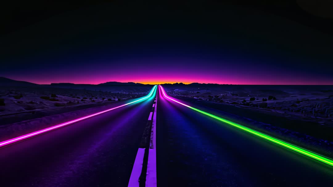 AI Generated Video. Video clip showing neon strips lighting two-lane highway at dusk, creating strong vanishing point toward glowing horizon. Vibrant magenta, cyan, and green bands reflecting on asphalt and roadside, evoking cinematic neon-noir mood and futuristic atmosphere. Scene working well for tech, cyberpunk, synthwave, automotive, travel, and music projects. Use as looped background for website hero, app intro, concert visuals, product promo, or social campaign. Suggest color grading toward high contrast, adding subtle motion blur, speed ramping for dramatic reveal, or overlaying text and lower thirds for title sequence. Suitable for TV commercial, digital ad, social reel, soundtrack video, or presentation opener. Resolution and composition supporting cinematic crop and safe areas for on-screen copy.