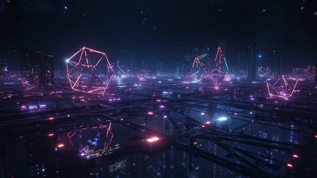 - Glowing Neon Polyhedra in Futuristic Digital Landscape