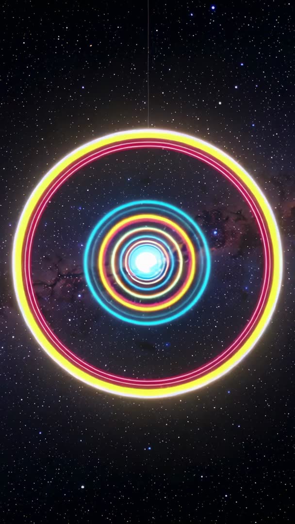 AI Generated Image. Showing glowing orb brightening against deep starfield while concentric neon rings expand and pulse in vivid cyan, magenta and yellow hues. Featuring seamless radial loop and slow inward animation suited for vertical video formats (9:16). Serving as futuristic backdrop for social media stories, TikTok, Reels, music visualizers, sci-fi title intros, app splash screens, event projection and VJ performance loops. Working well for tech product promos, electronic music content, meditation visuals, branding reels and UI motion tests. Offering high contrast and hypnotic motion that draws attention in short-form video and live visuals. Allowing easy color grading and audio-reactive syncing for customization. Looping perfectly for 5-30 second clips or extended ambient playback, export-ready for web and mobile delivery.