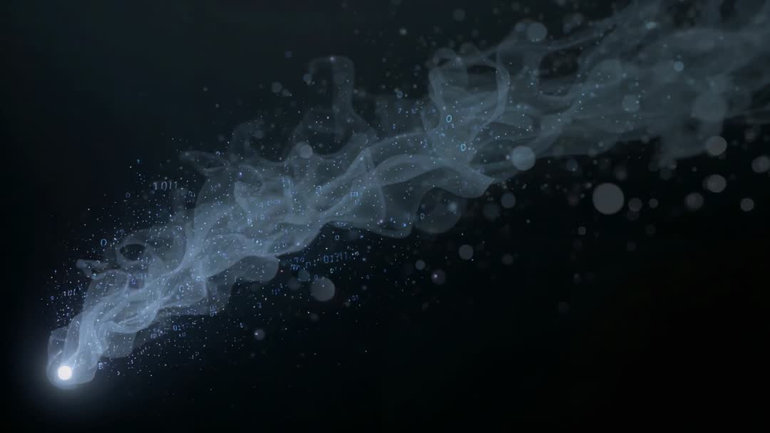 AI Generated Image. Short loopable video clip showing glowing orb emitting smoky plume of digital particles and binary digits while traveling through dark void. Soft bokeh highlights and drifting vapor creating cinematic comet-like trail and subtle sense of depth. Use for technology presentations, AI and data visualizations, sci-fi title sequences, website hero backgrounds, app splash screens, and music visualizers. Layering-friendly with dark negative space for overlaying text or logos. Rendered with gentle motion blur and particle depth for smooth playback and easy looping. Ideal for marketing, motion design, broadcast intros, and educational content explaining data flow or digital concepts.