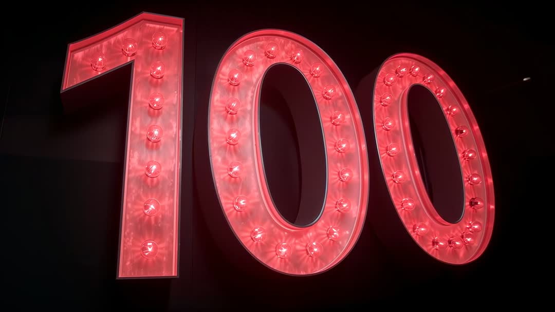 AI Generated Image. Footage showing red marquee numerals 100 glowing with round bulbs against deep black background, creating bold, cinematic contrast. Close-up composition highlighting bulb texture, reflective sign face, and soft halo glow, offering strong visual focus for motion projects. Footage working well for celebrating milestone events, centennial campaigns, anniversary promotions, retail window displays, theater intros, countdown sequences, and social media reels. Clip pairing easily with text overlays, animated titles, or logo reveals for high-impact branding, event openers, and promotional spots. Suitable for loopable backgrounds, website headers, hero banners, digital advertising, print mockups, and stage design visualizations.