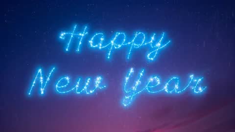 AI Generated Video. Video showing glowing blue script spelling Happy New Year, formed from shimmering particle lines and scattered sparkles. Animation featuring pulsing neon glow over navy-to-purple starry gradient, creating cinematic festive night atmosphere. Clip working well for holiday greeting videos, social media countdowns, website hero banners, email headers, event promos, digital signage, and broadcast openers. File offering loopable motion and clean edges for easy overlay on footage or graphics. Color palette and particle behavior allowing simple customization of text, timing, and hue to match brand identity or campaign styling.